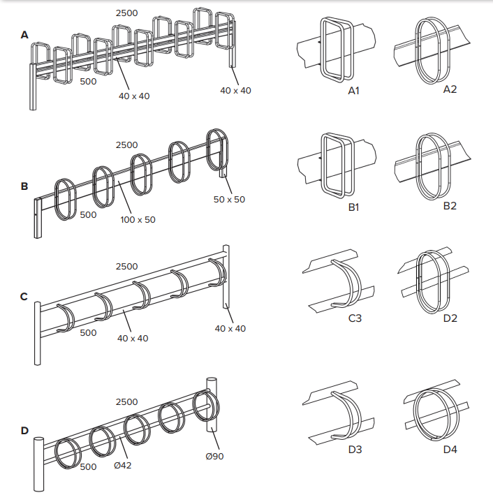 Bici cykelstativer tilbyder forskellige stel- og bøjlekombinationer, så de kan skræddersys efter behov: